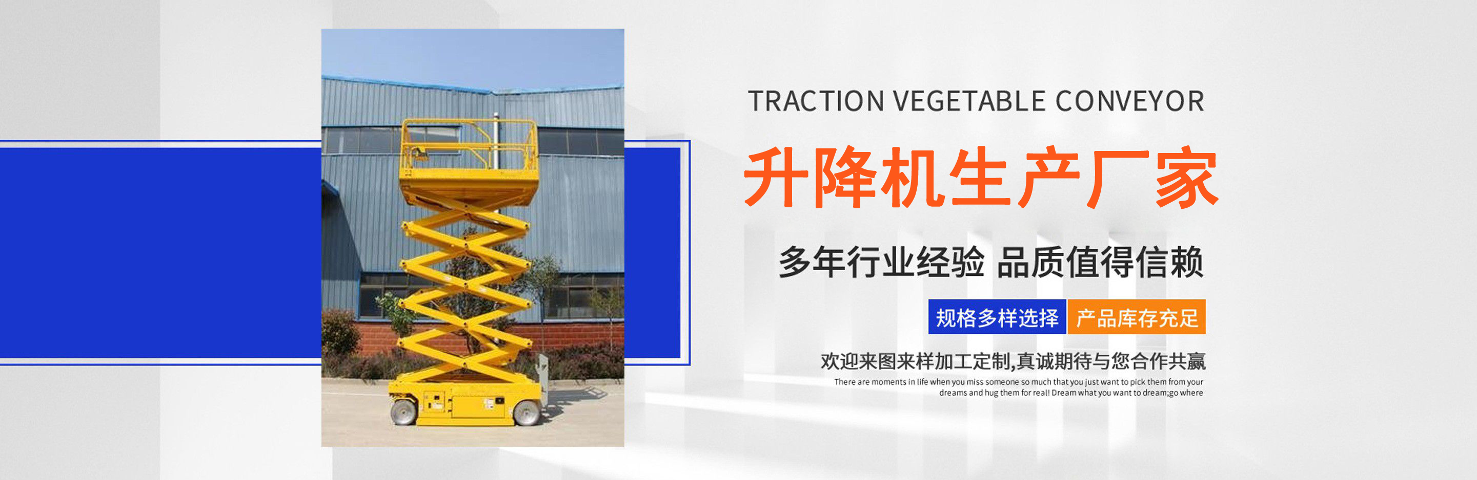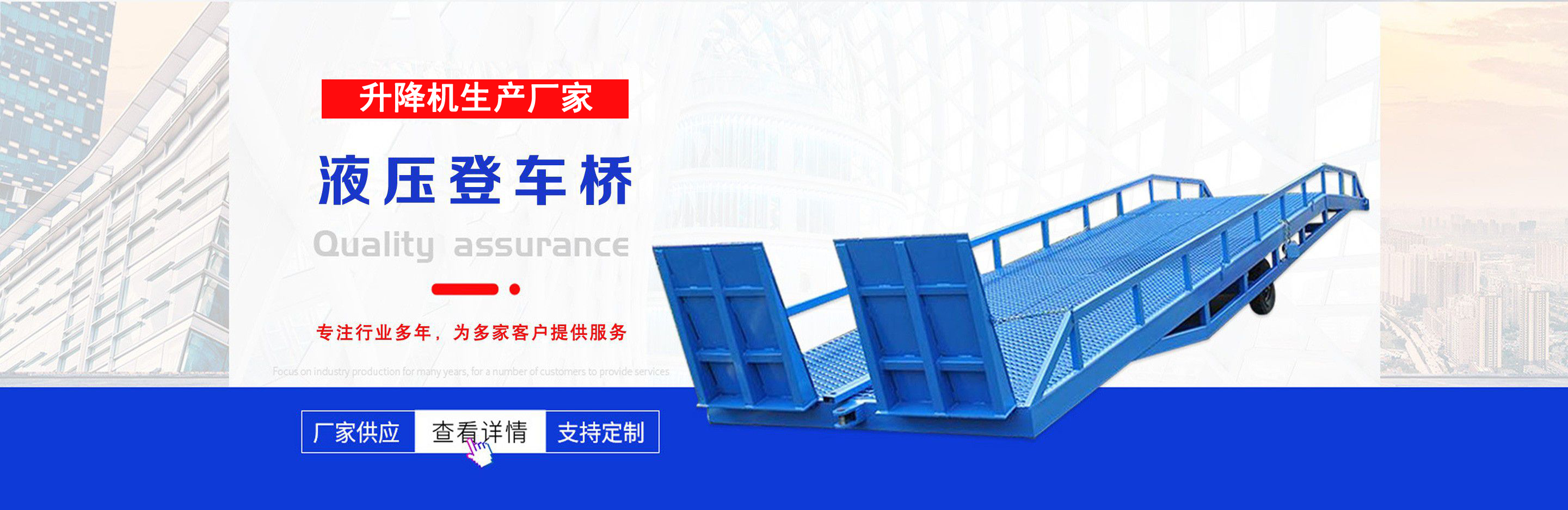 升降機生產廠家是專業從事升降平臺,液壓貨梯,卸豬臺,平板拖車,液壓提升機,移動式升降機,升降平臺車,高空作業設備,貨梯廠家,液壓登車橋等升降機械產品制造十余年,服務過各大國內外企業?! ∽怨緞摿⒁詠恚涍^長期對液壓升降臺的研制和探索,積累了豐富的專業制造技術和寶貴經驗。憑借豐富的專業技術及不斷開拓創新的精神,現已成為專業于升降機械的公司?! ¢L期以來,憑借公司不斷的壯大及對液壓技術的不斷改進和探索。能根據客戶不同的要求設計一套合理、完善的方案供客戶參考。現有產品:升降平臺,液壓貨梯,卸豬臺,平板拖車,液壓提升機,移動式升降機,升降平臺車,高空作業設備,貨梯廠家,液壓登車橋等。本產品在各類工礦企業、港口物流以及其它領域均發揮著重要的作用。始終以“以信譽求生存、以技術求發展”為本廠的經營理念。只要你選購我廠的產品,無論你身在何方都能得到我們迅捷優良的服務。 公司自成立已經來本著"團結、求實、創新、互贏"的理念,以先進的技術和服務,為客戶建造滿意的產品。幾年來受到廣大客戶的好評。...